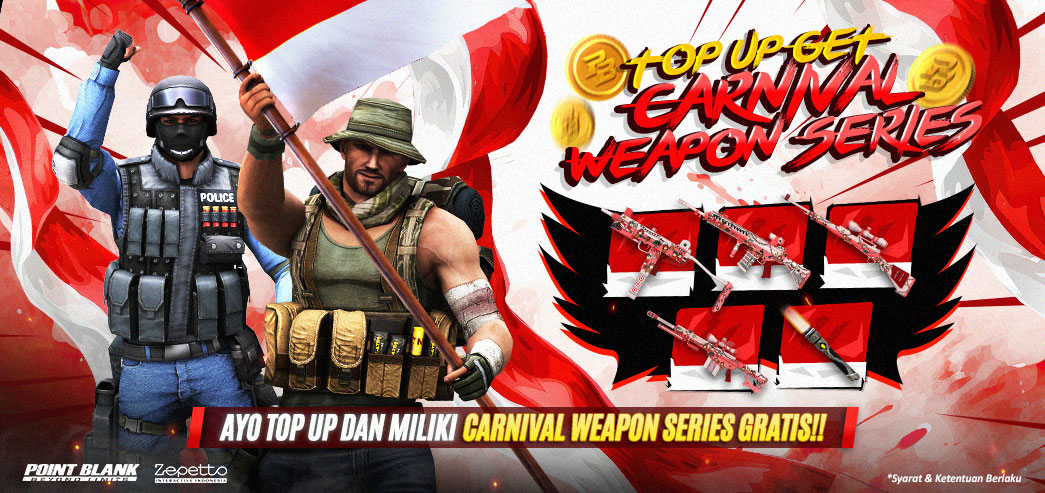 *(Reward Spesial Item per 1 User ID Max 1 Item Per Denom) Contoh : Kamu telah Top Up 1.200 PB Cash maka kamu akan mendapatkan T77 Carnival (1 Hari) kemudian kamu Top Up Kembali 6.000 PB Cash maka kamu akan mendapatkan Kar98k TSR Carnival (3 Hari) kemudian kamu Top Up Kembali dengan Denominasi yang sama yaitu 1.200 atau 6.000 PB Cash maka Reward TIDAK akan kamu dapatkan kembali **(Syarat ketentuan dapat berubah sewaktu-waktu tanpa pemberitahuan terlebih dahulu) INFO PENTING : Bila Troopers baru melakukan registrasi akun baru via website maka kalian HARUS membuat karakter terlebih dahulu di dalam game dan setelah itu melakukan Top Up sesuai Denom untuk mendapatkan item Reward. Bila Troopers hanya melakukan registrasi akun baru via website kemudian melakukan Top Up sesuai Denom TANPA membuat karakter di dalam game maka kalian TIDAK akan mendapatkan Reward Item pada karakter kalian. Reward HANYA BERLAKU untuk Nominal Denom yang Tertera diatas. Bila kalian melakukan Top Up selain dari Nominal Denom yang di tentukan maka tidak akan mendapatkan Reward Item. Ayo segera Top Up dan dapatkan Carnival Weapon Series secara Gratis ~ Jangan Sampai Ketinggalan Yah ~ - Terima Kasih - --------------- |