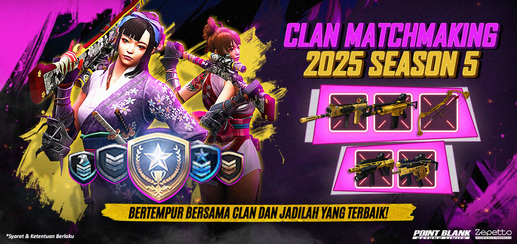 Clan Rank Matchmaking Telah Dimulai Kembali Ayo bermain bersama Clan jadi semakin seru. ![]() CLAN MATCHMAKING 2025 SEASON 5 Periode : 16 September - 27 October 2025 Mode Clan Matchmaking : ini hanya bisa dimainkan dalam 5 vs 5 berdasarkan clan point dari clan kalian.