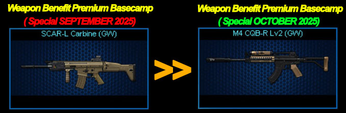 Hi, Troopers! Berikut adalah Perubahan Benefit Weapon Premium Basecamp pada Oktober 2025 Periode Benefit : 7 Oktober 2025 (Setelah Maintenance) - 3 November 2025 ![]() Perubahan Premium Basecamp Benefit ini hanya pada Special Weapon Bulanan saja