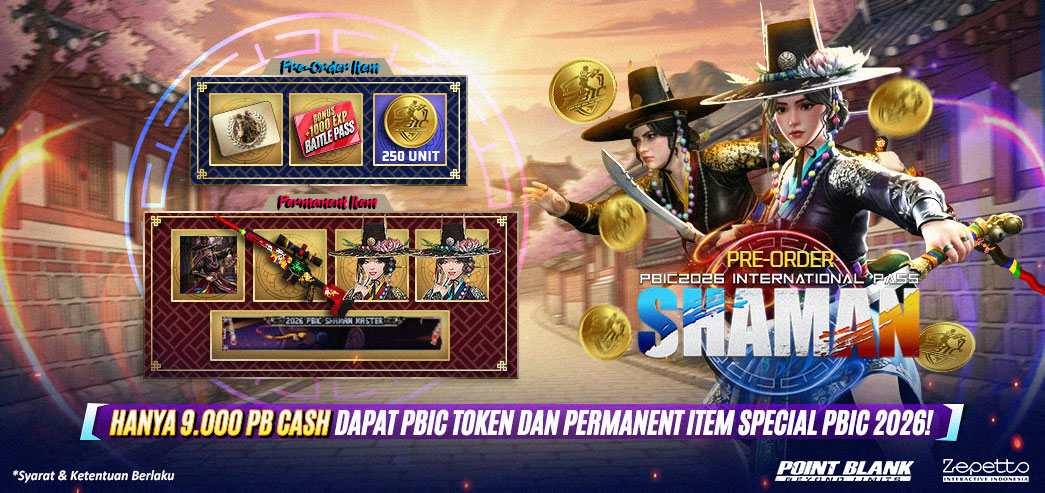 (1 ID hanya berkesempatan 1 kali saja) ![]() 10. Seluruh Item, Ketentuan & Waktu dapat berubah sewaktu - waktu tanpa pemberitahuan terlebih dahulu ============================================ ![]() Battle Pass kali ini merupakan Event Seasonal di Point Blank Indonesia dengan Periode Event 50 Hari dan Max Level 60. Kalian Bisa mendapatkan Berbagai Item Menarik di Setiap Kenaikan Level Battle Pass Battle Pass Nantinya Bisa kalian Lihat Di Bagian Kiri Bawah pada Lobby Setelah Pemilihan Server ![]() Beberapa Item Spesial yang bisa kalian dapatkan dari PBIC 2026 INTERNATIONAL PASS : SHAMAN ![]() ![]() ![]() ![]() ![]() ![]() ![]() ![]() ![]() ![]() ![]() ![]() ![]() ![]() ![]() ![]() Fitur Gesture Emote dan Item Gesture Emote ![]() ![]() dan masih banyak berbagai macam reward lainnya. Kalian Bisa Menukarkan Item PBIC Token dengan Battle Pass Item atau Permanent Item Bila Telah Berhasil Mengumpulkan Sejumlah Tertentu PBIC Token Pada Battle Pass kali ini akan ada Item Spesial yang akan membuat Senjata kalian Terkamuflasi / Terlihat Menghilang Item ini HANYA akan Tersedia di Premium Shop Battle Pass ![]() ![]() Dari Battle Pass ini kalian juga bisa mendapatkan 100% Permanen Item Tanpa di Undi hanya dengan meningkatkan Level Battle Pass : ![]() ![]() ![]() ![]() ![]() ![]() INFO PENTING : Pada PBIC 2026 INTERNATIONAL PASS : SHAMAN kali ini, REPAIR PERMANENT ITEM yang kalian dapatkan dari PBIC 2026 INTERNATIONAL PASS : SHAMAN akan menggunakan Point Namun Biaya Point yang dibutuhkan untuk Repair akan lebih besar dibandingkan dengan Permanent Item yang didapatkan dari Permanent Random Box Biasa