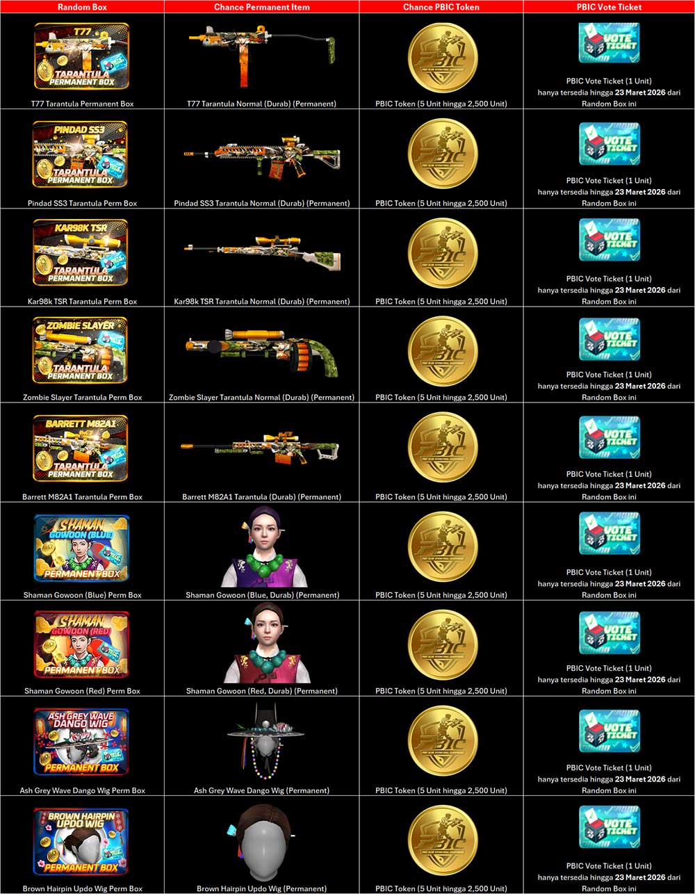 * Waktu & Item Reward dapat berubah sewaktu - waktu tanpa pemberitahuan terlebih dahulu ![]() Hi, Troopers! Dapatkan Beragam Permanent Weapon Tarantula Series, Permanent Idol Character dan Permanent Wig dari Special Random Box Terbaru. Selain Permanent Item Kalian juga bisa mendapatkan Tambahan PBIC Vote Ticket dan PBIC Token dari Special Random Box berikut ini : Tersedia Di Shop : 24 Februari - 27 April 2026 ![]() --------------- | ||||||||||||||||||||||||||||||||||||||||||||||||||||||||||||||||||||||||||||||||||||||||||||||||||||||||||||||||||||||||||||||||||||||||||||||||||||||||||||||||||||||||||||||||||||||||||||||||||||||||||||||||||||||||||||||||||||||||||||||||||||||||||||||||||||||||||||||||||||||