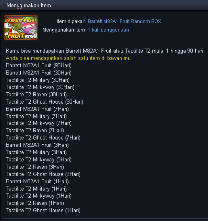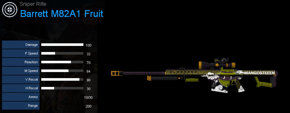 dengan durasi mulai 1 sampai dengan 90 Hari di dalam Random Box ini!! ![]() Berikut adalah tampilan Stat dari Barret M82A1 Fruit Weapon ![]() Bagi Troopers yang telah membeli Barrett M82A1 Fruit Random BOX minimal 1 Unit