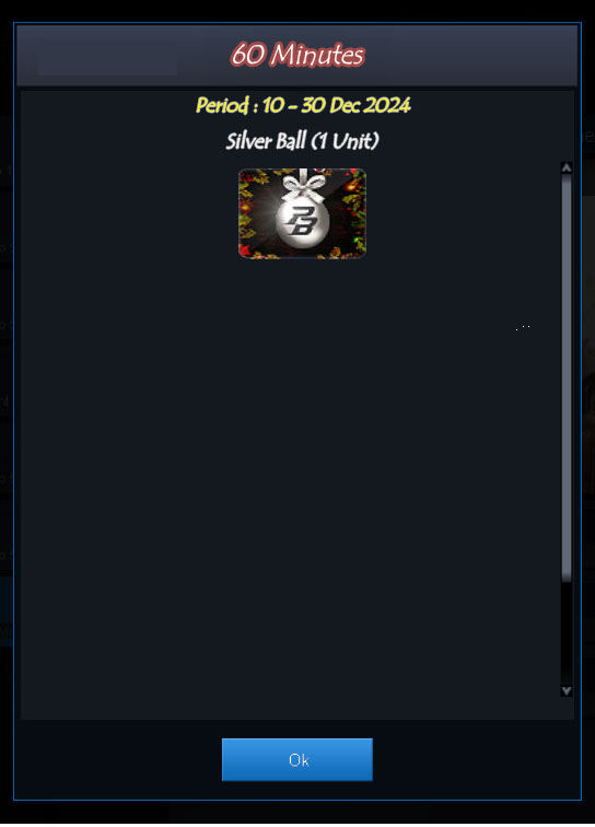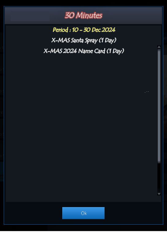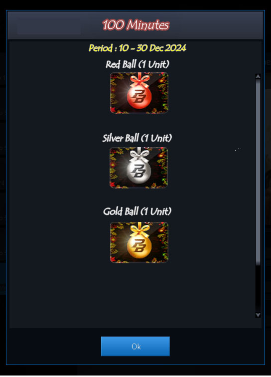 * Waktu & Item Reward dapat berubah sewaktu - waktu tanpa pemberitahuan terlebih dahulu ![]() Periode Event : 13,14,15,20,21,22,27,28,29 Desember 2024 * Login selama 30 Menit pada hari Jum'at, Sabtu dan Minggu untuk mendapatkan item dibawah ini ![]() * Waktu & Item Reward dapat berubah sewaktu - waktu tanpa pemberitahuan terlebih dahulu ![]() Periode Event : 10 - 30 Desember 2024 Bermain tanpa putus selama 30 , 90 dan 120 menit kalian bisa mendapatkan salah satu item - item dibawah ini ![]() ![]() ![]()