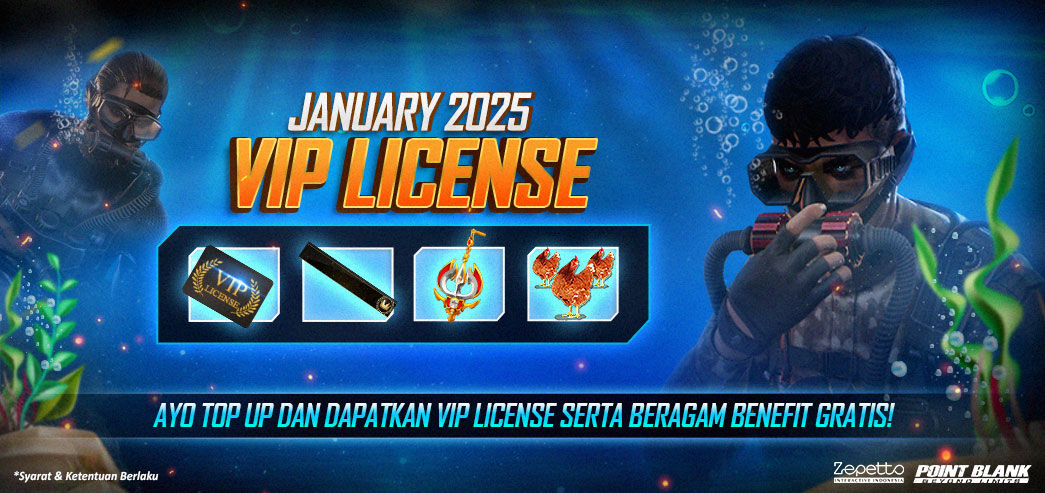 Hi, Troopers! Pada Bulan ini VIP License kembali lagi lho..!! Bagi Para Seluruh Troopers yang melakukan pembelian PB Cash dengan Total Akumulasi Top Up 12.000 PB Cash akan langsung mendapatkan berbagai Reward berupa Spesial Item. Segera gunakan VIP License kalian sebelum tanggal EXPIRED. Periode Terhitung Mulai : 5 Januari 2025 (Mulai 00.01 WIB) - 31 Januari 2025 (hingga 23.59 WIB) Total Akumulasi Top Up 12.000 PB Cash ![]() ![]() Syarat dan Ketentuan : 1. VIP License (Renew) 30 Days akan EXPIRED / TERHAPUS dari Inventory secara otomatis pada 1 Februari 2025 walau pun sisa durasi VIP License (Renew) yang kamu miliki masih tersisa beberapa hari lagi. (Kondisi ini berlaku baik dalam keadaan item digunakan ataupun tidak digunakan di inventory) Contoh : Melakukan Total Akumulasi Top Up 12.000 PB Cash pada 28 Januari 2025 dan kamu akan menerima VIP License (Renew) 30 Days di dalam inventory pada saat tanggal memasuki 1 Februari 2025 VIP License (Renew) akan EXPIRED / TERHAPUS otomatis dalam inventory kalian. 2. Item ini akan langsung masuk ke inventory kalian setelah berhasil melakukan Total Akumulasi Top Up 12.000 PB Cash