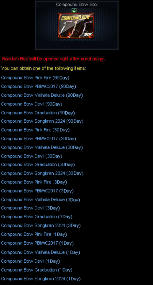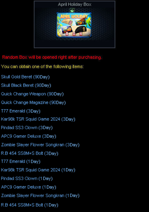 Syarat Ketentuan : 1. Khusus untuk ID yang BELUM PERNAH melakukan Pembelanjaan / Pembelian Item menggunakan PB Cash. 2. Untuk Melakukan Pembelian Jenis Starter Pack dengan Durasi & Diskon yang kalian Inginkan maka harus mencapai Total Login / Attendance Tertentu Contoh : Ingin Membeli Starter Pack T77 Gold dengan Durasi 30 Days & Diskon 80% Maka kalian harus mencapai Total Login / Attendance 5 Hari Terlebih dahulu agar promo diskon Starter Pack T77 Gold dengan Durasi 30 Days & Diskon 80% ini keluar / tampil di In-game. 3. Bila kalian sudah mencapai Total Login / Attendance Tertentu, maka item-item promo yang telah di sediakan diatas dengan Durasi Sebelumnya TIDAK AKAN keluar / tampil kembali. Contoh : Kalian telah mencapai Total Login / Attendance 3 Hari maka promo Starter Pack T77 Gold, Starter Pack Kar98k TSR Gold, dan Starter Pack Pindad SS3 Gold dengan Durasi 7 Days & Diskon 75% yang akan keluar / tampil di dalam game dan Durasi 3 Days dengan Diskon 70% TIDAK AKAN keluar / tampil kembali. 4. 1 ID hanya MEMPUNYAI 1X KESEMPATAN pembelian di antara item-item promo dengan Durasi yang telah di sediakan Contoh : Telah Melakukan Pembelian Salah Satu Item Diskon Starter Pack pada Attendance Day 1 maka kalian TIDAK AKAN bisa melakukan pembelian Item Diskon Starter Pack pada Attendance Day 3 dan Day 5. 5. Bagi kalian yang sudah melakukan pembelian item menggunakan PBCash sebelumnya, item di atas tidak akan keluar / tampil. 6. Item, Ketentuan & Waktu dapat berubah sewaktu - waktu tanpa pemberitahuan terlebih dahulu Isi dari Starter Pack T77 Gold : ![]() Isi dari Starter Pack Kar98k TSR Gold :