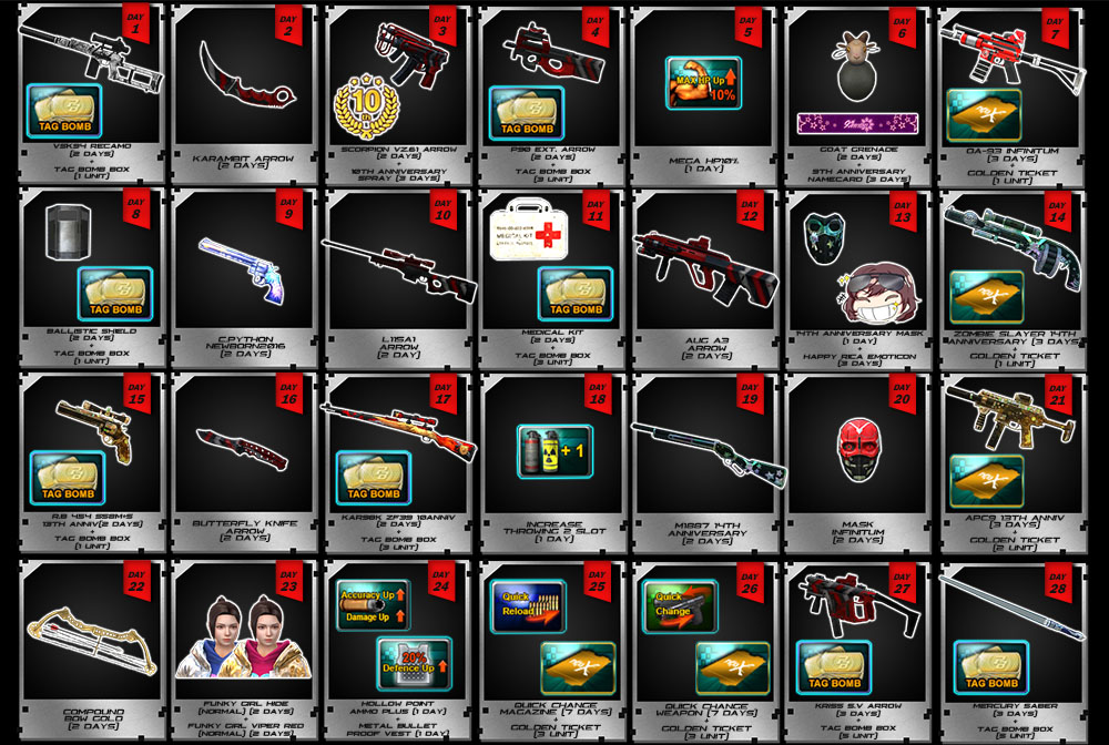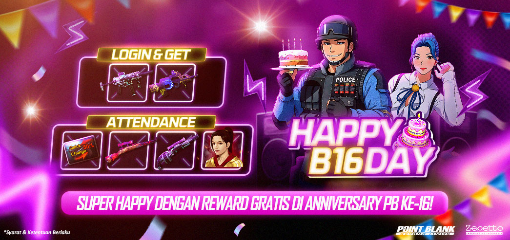 Periode Event : 24 - 30 Juni 2025 Special 16th Anniversary Point Blank Periode Event : 27 & 28 Juni 2025 Tahun Baru Islam (Pukul 00:01 ~ 23:59 WIB) ![]() * 1 ID hanya bisa mendapatkan Reward 1 kali selama periode event berlangsung. ** Seluruh Item TIDAK AKAN langsung terpakai / use sehingga masih bisa kalian simpan di Inventory. *** Waktu & Item Reward dapat berubah sewaktu - waktu tanpa pemberitahuan terlebih dahulu ========= ![]() Jangan terlewatkan kalian juga bisa menikmati Exp Boost lho * EXP Boost di Hari Special untuk Kamu yang Special |