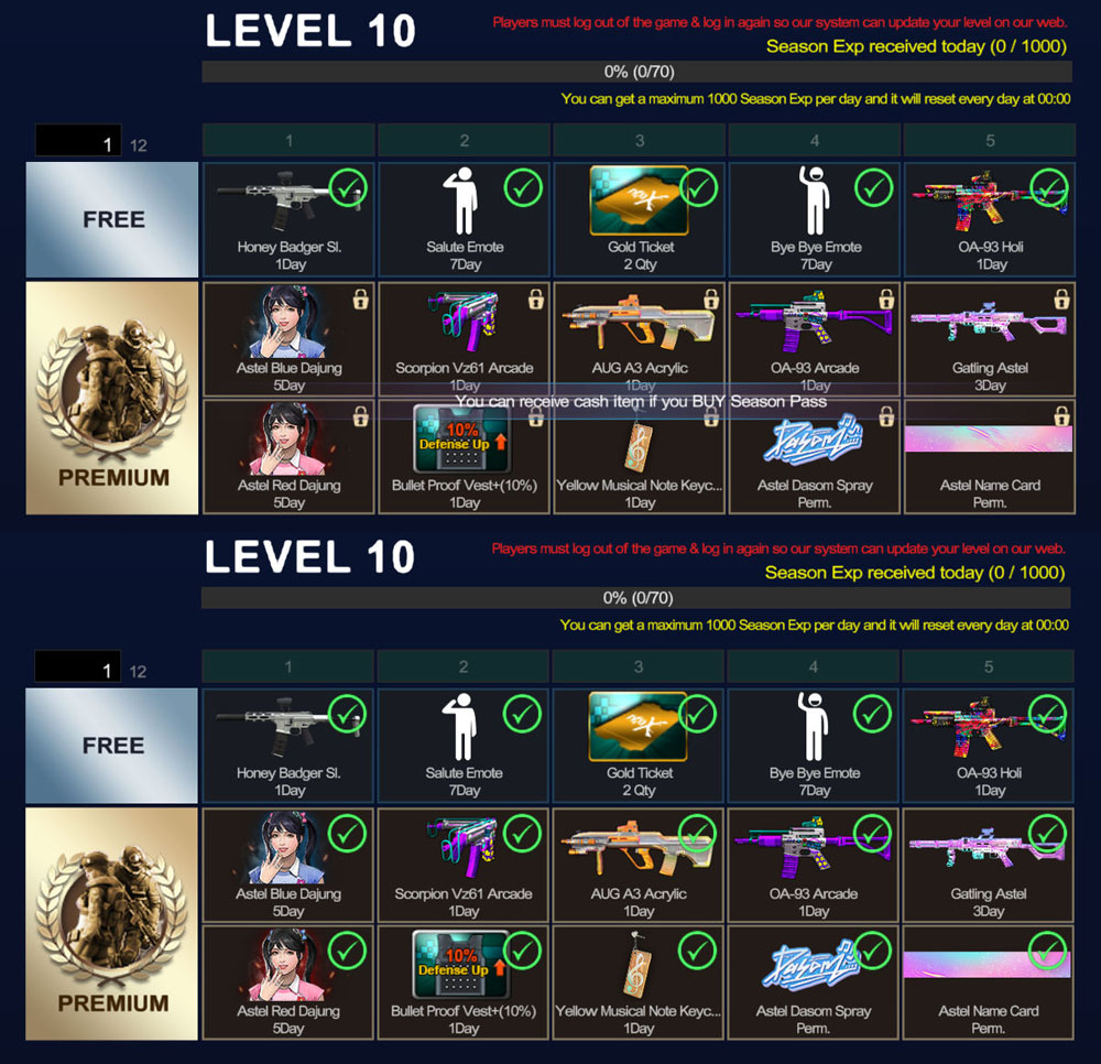 Battle Pass kali ini merupakan Event Seasonal di Point Blank Indonesia dengan Periode Event 50 Hari dan Max Level 60. Kalian Bisa mendapatkan Berbagai Item Menarik di Setiap Kenaikan Level Battle Pass Battle Pass Nantinya Bisa kalian Lihat Di Bagian Kiri Bawah pada Lobby Setelah Pemilihan Server ![]() Battle Pass akan terbagi menjadi 2 yaitu Free dan Premium Setelah Login Kalian akan mendapatkan Free Battle Pass Level 1 ![]() Kalian bisa mendapatkan tambahan Hadiah Battle Pass dengan Membeli Premium Battle Pass dengan menggunakan PB Cash ![]() Bila pada Free Battle Pass kalian telah mencapai Level Tertentu maka begitu kalian membeli Premium Battle Pass Level Premium Battle Pass Kalian Juga akan sama mengikuti Free Battle Pass Seluruh Reward Premium Battle Pass juga akan langsung kalian Terima sesuai dengan level yang telah kalian Capai ![]() Untuk Meningkatkan Level Battle Pass, kalian membutuhkan Season EXP Ada Beberapa Cara untuk mendapatkan Season EXP Cara Pertama adalah dengan menyelesaikan Battle Permainan Season EXP dari Battle Permainan memiliki Limit maksimal 1000 Season EXP dari Hasil Battle per hari bila telah mencapai Limit kalian tidak akan mendapatkan lagi Season EXP dari Hasil Battle pada Hari tersebut ![]() Cara Kedua kalian bisa mendapatkan Season EXP dengan membeli Season EXP di Menu Level Battle Pass yang kalian inginkan 1 EXP = 7 PB Cash