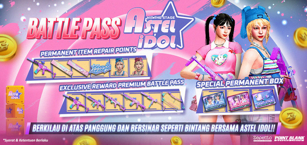*Syarat, Waktu & Item Reward dapat berubah sewaktu - waktu tanpa pemberitahuan terlebih dahulu INFO PENTING : Pada BATTLE PASS ASTEL IDOL : HIT THE STAGE kali ini, REPAIR PERMANENT ITEM yang kalian dapatkan dari BATTLE PASS ASTEL IDOL : HIT THE STAGE akan menggunakan Point Namun Biaya Point yang dibutuhkan untuk Repair akan lebih besar dibandingkan dengan Permanent Item yang didapatkan dari Permanent Random Box Biasa