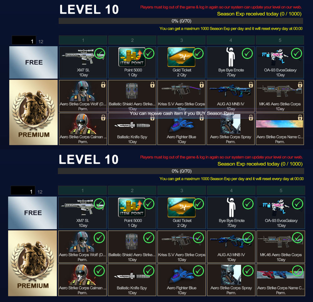 Preview Tampilan Weapon XM7 Aero Strike Corps (Durab) dan Kunai Aero Strike Corps (Durab) ![]() ![]() Note : Seluruh Item, Ketentuan & Waktu dapat berubah sewaktu - waktu tanpa pemberitahuan terlebih dahulu ![]() Berikut adalah Season EXP yang kalian butuhkan untuk meningkatkan level Battle Pass Kalian.