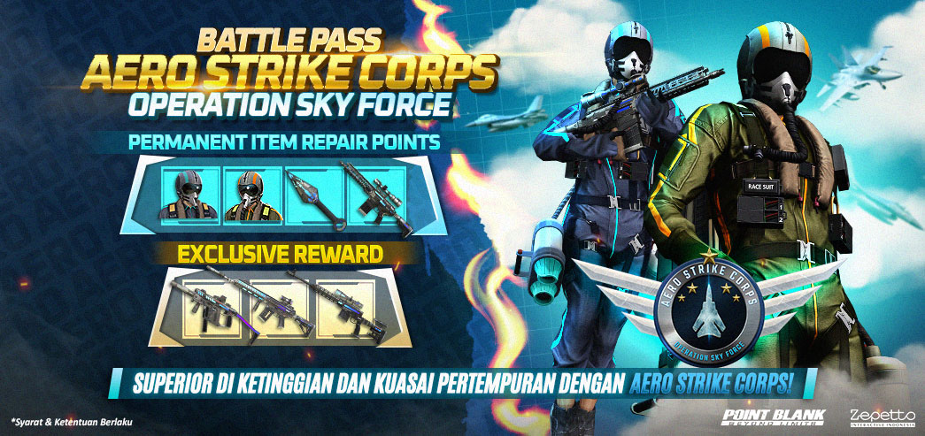 *Syarat, Waktu & Item Reward dapat berubah sewaktu - waktu tanpa pemberitahuan terlebih dahulu INFO PENTING : Pada BATTLE PASS AERO STRIKE CORPS : OPERATION SKY FORCE kali ini, REPAIR PERMANENT ITEM yang kalian dapatkan dari BATTLE PASS AERO STRIKE CORPS : OPERATION SKY FORCE akan menggunakan Point Namun Biaya Point yang dibutuhkan untuk Repair akan lebih besar dibandingkan dengan Permanent Item yang didapatkan dari Permanent Random Box Biasa