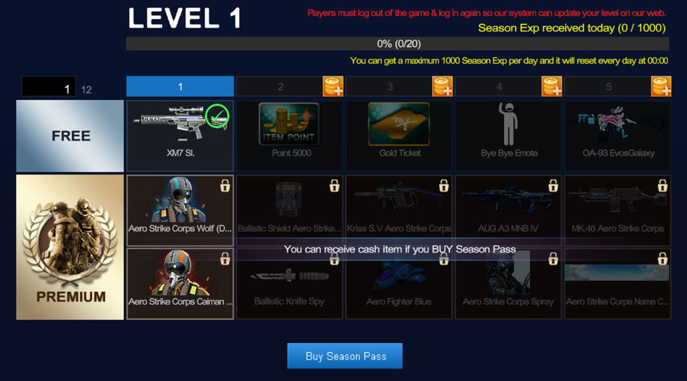 Battle Pass kali ini merupakan Event Seasonal di Point Blank Indonesia dengan Periode Event 50 Hari dan Max Level 60. Kalian Bisa mendapatkan Berbagai Item Menarik di Setiap Kenaikan Level Battle Pass Battle Pass Nantinya Bisa kalian Lihat Di Bagian Kiri Bawah pada Lobby Setelah Pemilihan Server ![]() Battle Pass akan terbagi menjadi 2 yaitu Free dan Premium Setelah Login Kalian akan mendapatkan Free Battle Pass Level 1 ![]() Kalian bisa mendapatkan tambahan Hadiah Battle Pass dengan Membeli Premium Battle Pass dengan menggunakan PB Cash ![]() Bila pada Free Battle Pass kalian telah mencapai Level Tertentu maka begitu kalian membeli Premium Battle Pass Level Premium Battle Pass Kalian Juga akan sama mengikuti Free Battle Pass Seluruh Reward Premium Battle Pass juga akan langsung kalian Terima sesuai dengan level yang telah kalian Capai ![]() Untuk Meningkatkan Level Battle Pass, kalian membutuhkan Season EXP Ada Beberapa Cara untuk mendapatkan Season EXP Cara Pertama adalah dengan menyelesaikan Battle Permainan Season EXP dari Battle Permainan memiliki Limit maksimal 1000 Season EXP dari Hasil Battle per hari bila telah mencapai Limit kalian tidak akan mendapatkan lagi Season EXP dari Hasil Battle pada Hari tersebut ![]() Cara Kedua kalian bisa mendapatkan Season EXP dengan membeli Season EXP di Menu Level Battle Pass yang kalian inginkan 1 EXP = 7 PB Cash