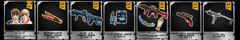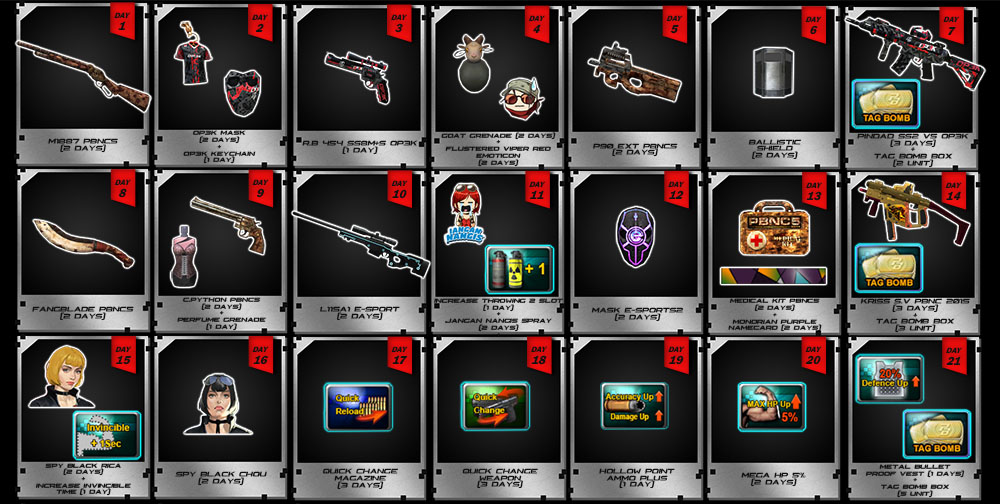 ![]() Periode Event : 6 - 26 Januari 2026 Dapatkan item - item menarik dari event attendance, jangan sampai terlewatkan yah..!!! ![]() * Seluruh Item TIDAK AKAN langsung terpakai / use sehingga masih bisa kalian simpan di Inventory. ** Waktu & Item Reward dapat berubah sewaktu - waktu tanpa pemberitahuan terlebih dahulu Kalian juga bisa mendapatkan TAMBAHAN Quick Change, Quick Reload, dan Golden Ticket dengan Menyelesaikan Daily Quest dengan Mudah Info Daily Quest KLIK IMAGE Berikut ![]() Jangan Lupa Untuk Login ke dalam game yah!! dan Klaim Item Berikut :