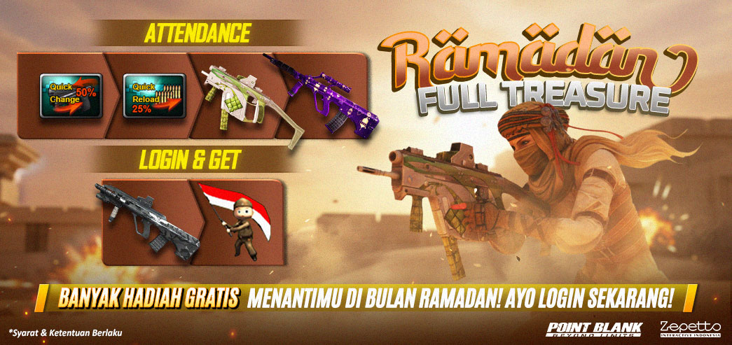 (Pukul 00:01 ~ 23:59 WIB) ![]() ![]() * 1 ID hanya bisa mendapatkan Reward 1 kali selama periode event berlangsung. ** Khusus Reward Free Item Ramadan akan langsung TERPAKAI / USE *** Selain Reward Free Item Ramadan, Item lain yang didapatkan pada event ini TIDAK AKAN langsung terpakai / use sehingga masih bisa kalian simpan di Inventory. **** Waktu & Item Reward dapat berubah sewaktu - waktu tanpa pemberitahuan terlebih dahulu ========= ~ Terima Kasih ~ --------------- |