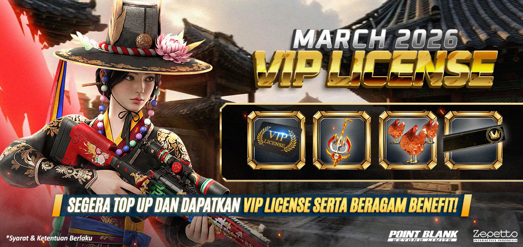 Pada Bulan ini VIP License kembali lagi lho..!! Bagi Para Seluruh Troopers yang melakukan pembelian PB Cash dengan Total Akumulasi Top Up 12.000 PB Cash akan langsung mendapatkan berbagai Reward berupa Spesial Item. Segera gunakan VIP License kalian sebelum tanggal EXPIRED.