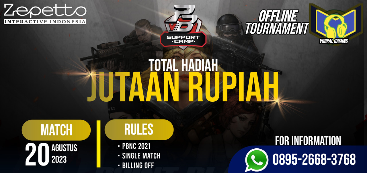 Tournament offline ini akan dilaksanakan di Warnet Vorpal Gaming, Kabupaten Pinrang, Sulawesi Selatan (link GMaps: https://goo.gl/maps/oXnE79QDgtsbRvyk7) di tanggal 20 Agustus 2023. Untuk troopers sekitaran Pinrang boleh langsung join yaa, biaya pendaftaran hanya Rp 50.000 saja! Dan slot terbatas hanya 16 team saja! Rules yang digunakan di Tournament Vorpal Gaming Season 3: * Rules 2020/2021 * Polosan * Karakter HP 100 * No Effect timbul ke lawan * 1 Team 4 Dual * Bandlist Senjata HK-417, HABAR, MSBS * No Macro ( lawan Team akan saling Cek Mouse masing" ) * Map Downtown, Luxvile, Blowcity, Stromtube, Safehouse, Midtown, Sandstrom, Provence Yuk langsung saja daftarkan team kalian ke nomor: 0895-2668-3768 (Arafah) ![]() Terima Kasih Team Esport PT Zepetto Interactive Indonesia