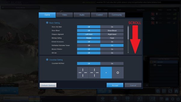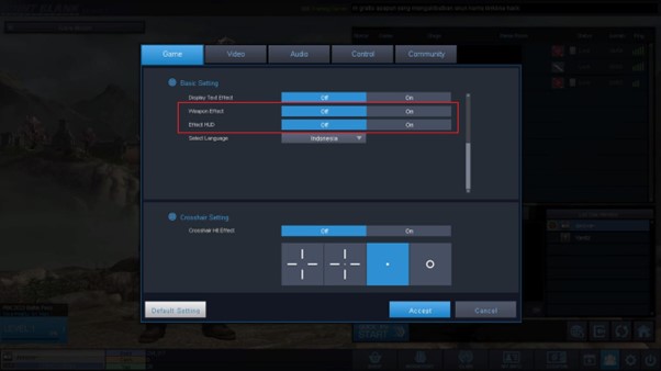 3.5 Weapon & Item Weapon dengan dengan effect hit screen boleh dipergunakan selama mempunyai spesifikasi yang sama (kecuali jumlah ammo), berikut penjelasan mematikan effect hit screen senjata lawan: 1. Klik setting atau pengaturan di dalam game Point Blank, di bagian Default Setting scroll kebawah. ![]() 2. Pilih opsi OFF pada bagian Weapon Effect dan Effect HUD, lalu apply. ![]() 3.6 Catatan Penting