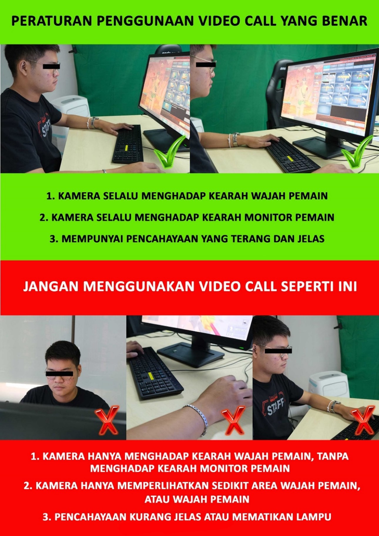 • Technical Meeting akan dilakukan kepada peserta pada 5 hari hingga 1 hari sebelum hari pertandingan. • Tim yang tidak hadir dalam technical meeting dianggap telah mengetahui dan menyetujui Rules Point Blank Official Tournament 2025. 5. Peraturan Tim • Setiap tim harus memiliki 1 perwakilan tim yang ditunjuk sebagai kapten tim yang bertanggung jawab atas timnya. Tugas kapten tim ini adalah untuk mengkoordinasi dan mengkonfirmasi timnya untuk segala hal yang menyangkut tentang pertandingan kepada Tim Panitia. • Setiap perwakilan tim harus selalu melapor dan memantau di Channel discord yang ditentukan oleh Tim Panitia. • Setiap anggota timnya harus bermain sesuai dengan data KTP (ID Card) dan ID Akun Zepetto yang didaftarkan. Jika ditemukan suatu tim memainkan yang bukan anggota terdaftarnya, maka tim tersebut akan terkena diskualifikasi. 6. Subsitusi Pemain • Subsitusi dengan pemain cadangan hanya dapat dilakukan pada saat pada saat pergantian map, atau pertandingan berikutnya. • Substitusi pemain untuk permainan pertama harus diberitahukan ke panitia 30 menit sebelum pertandingan dimulai. Jika tidak, maka list player utama akan digunakan. • Apabila pada saat pertandingan dimulai jumlah anggota sebuah tim tidak sampai 5 orang, pertandingan akan tetap berjalan dengan syarat jumlah anggota yang bermain paling sedikit 3 orang. Jika kurang, maka tim akan dinyatakan gugur. • Jika ada anggota tim yang terlambat datang ke pertandingan, mereka hanya bisa masuk pada saat pertukaran tim (change side saat ingame). 7. Peraturan Pertandingan Online Peraturan ini berlaku jika pertandingannya dilakukan secara online. • Setiap tim diwajibkan melakukan relogin screen sharing discord sebelum pertandingannya dimulai. • Setiap tim diwajibkan melakukan video call dengan tim panitia selama pertandingan berlangsung. • Sebelum pertandingan dimulai, setiap anggota tim peserta diwajibkan melakukan verifikasi ulang dengan tim panita dengan memegang Data diri sesuai dengan yang didaftarkan. • Diwajibkan kamera video call selalu mengarah ke wajah & monitor peserta. Contoh kamera video call yang valid: ![]() • Diwajibkan berpakaian rapih selama video call berlangsung. • Player tidak diperkenankan untuk merokok selama melakukan video call dengan tim panitia. • Disarankan kuota internet dan baterai selalu terisi selama pertandingan berlangsung. • Pada saat pertandingan sedang berjalan (termasuk pada saat Pause/Tactical Timeout atau pada saat adanya diskoneksi dari pemain), peserta dilarang melakukan minimize (alt+tab) dari Game Point Blank dengan alasan apapun (kecuali memperbaiki suara output/input pada Discord). Apabila melanggar, maka sanksi yang diberikan adalah Warning/Peringatan 1 hingga 3 (diskualifikasi) 8. Semangat Fair Play Tim • Fair Play adalah semangat bertanding secara jujur dan sportif. • Player harus memiiki attitude yang baik selama turnamen berlangsung. • Semua tim yang bergabung pada kompetisi yang menggunakan Rules Point Blank Official Tournament 2025 harus menjunjung tinggi fairplay. • Semua tim bisa melakukan protes selama masa waktu pertandingannya berlangsung. • Tim yang melakukan protes diluar masa waktu pertandingannya tidak akan diterima oleh tim panitia. • Keputusan dari pihak panitia adalah final dan tidak dapat diganggu gugat. 9. Wasit • Setiap pertandingan berlangsung akan dijaga oleh 1 orang yang bertugas sebagai wasit. • Wasit ini juga yang akan melakukan pemanggilan room dan pengawasan pertandingan. • Wasit dapat membuat keputusan dalam situasi yang tidak diperkirakan atau saat player mengajukan permintaan. • Hanya wasit utama yang dapat membuat keputusan untuk memberhentikan sementara atau mengulang atau mendiskualifikasi sesuatu pertandingan ketika player mengajukan permintaan atau atas alasan lainnya. • Wasit akan mendukung fair play dan jika perlu menghukum/ban segala halangan diluar pertandingan agar pertandingan berjalan secara lancar. • Pemain yang bukan bagian dari pertandingan yang sedang berlangsung tidak boleh berpartisipasi dalam diskusi ketika game diberhentikan. Hanya kapten, wasit dan panitia yang boleh melakukannya. Semua player harus berhenti melakukan hal-hal yang mereka lakukan sampai masalah selesai. • Beberapa alasan kenapa game diberhentikan sementara: 1. Masalah kesehatan pemain 2. Penggunaan program illegal atau tindakan yang melanggar peraturan oleh pemain 3. Permintaan dari kapten tim 4. Masalah teknikal/bencana alam 5. Alasan lainnya yang tidak dapat diprediksi 10. Ketepatan waktu • Peserta wajib untuk bersiap 30 menit sebelum setiap pertandingan berlangsung. • 10 menit sebelum pertandingan berlangsung, tim panitia akan memanggil peserta. • Toleransi waktu telat 10 menit dari waktu pertandingannya. Jika tim tidak hadir di tempat setelah dipanggil, maka tim akan dinyatakan gugur. • Jika suatu tim kurang dari 3 orang sesuai dengan waktu yang diberikan, maka tim tersebut akan dinyatakan gugur. • Tim yang tidak mengetahui info room yang diberikan oleh tim panitia tidak bisa melakukan protes. 11. Peralatan / Gear • Peserta dapat menggunakan equipment / peralatan sendiri (hanya mouse, mousepad, keyboard, headset). 12. Masalah Teknis/Diskoneksi • Jika ada permasalahan teknis komputer (PC atau jaringan) apapun masalahnya dan kondisi apapun ketika pertandingan sedang berlangsung dengan kondisi: 1. Belum terjadi kill pertama, maka pertandingan akan dihentikan dan akan diberikan jeda waktu maksimal 15 menit dan round akan dimulai kembali dari score terakhir. 2. Sudah terjadi kill pertama, maka pertandingan tetap dilanjutkan. Pertandingan akan dihentikan dan akan diberikan jeda waktu maksimal 15 menit dan round akan dimulai kembali dari score terakhir. 3. Jika terjadi mati lampu/RTO, maka pertandingan akan dihentikan selama 30 menit. Tim yang tidak bisa masuk kembali melewati waktu tersebut maka akan dinyatakan kalah (minimal pemain standby adalah 3 orang). *DILARANG mengganti slot, membuka invento