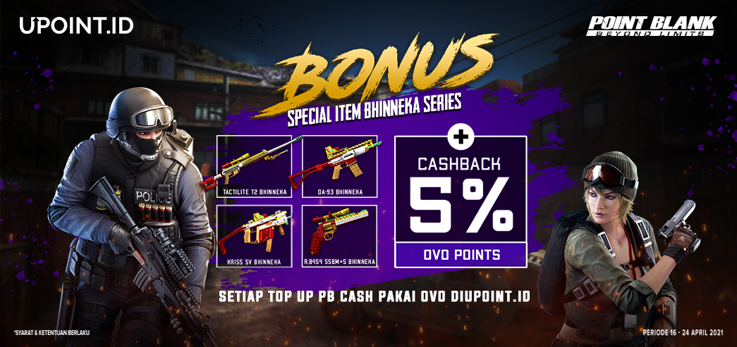 *(Reward Item Weapon akan diberikan paling lambat 14 hari kerja setelah periode event berakhir) *Hadiah, Ketentuan & Waktu dapat berubah sewaktu - waktu tanpa pemberitahuan terlebih dahulu Syarat Ketentuan : 1. Setiap pembelian PB Cash menggunakan metode pembayaran OVO di website UPOINT.ID akan mendapatkan akan mendapatkan Cashback 5% OVO dan bonus special item Point Blank. 2. Promo berlaku mulai dari 16 - 24 April 2021. 3. Cashback 5% dalam bentuk OVO Points dengan maksimum cashback yang diberikan hingga Rp100.000,- OVO Points/transaksi/periode. 4. Cashback berupa OVO Points (1 OVO Points = Rp1) dan cashback akan dikirim selambatnya 3 x 24 jam. 5. Bonus special item Point Blank berlaku maksimal 1 (satu) kali transaksi per Nomor HP (MSISDN) selama periode promo berlangsung. 6. Bonus special item Point Blank akan diberikan paling lambat 14 Hari Kerja setelah perode event berakhir 7. Transaksi harus berstatus berhasil/sukses pada periode event. jika ditemukan tindakan penyalahgunaan (abusive), kecurangan (fraudulent) dan/atau aktivitas mencurigakan lainnya di akun pengguna. 9. Jika transaksi sudah sesuai Syarat & Ketentuan namun Troopers tidak mendapatkan PB Cash, Troopers bisa langsung menghubungi Customer Service UPoint melalui email di cs@upoint.co.id atau telepon di 1500-853; atau cek riwayat transaksi anda di link https://upoint.id/help/history. 10. Jika Transaksi sudah sesuai Syarat & Ketentuan namun Troopers belum menerima bonus item Point Blank, maka Troopers Upoint bisa langsung mengisi form tiket di LINK INI 11. Jika OVO Points tidak diterima setelah transaksi, harap lapor ke Customer Service OVO di 1500 696 (24 Jam). *Hadiah, Ketentuan & Waktu dapat berubah sewaktu - waktu tanpa pemberitahuan terlebih dahulu ~ Terima Kasih ~