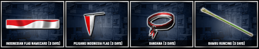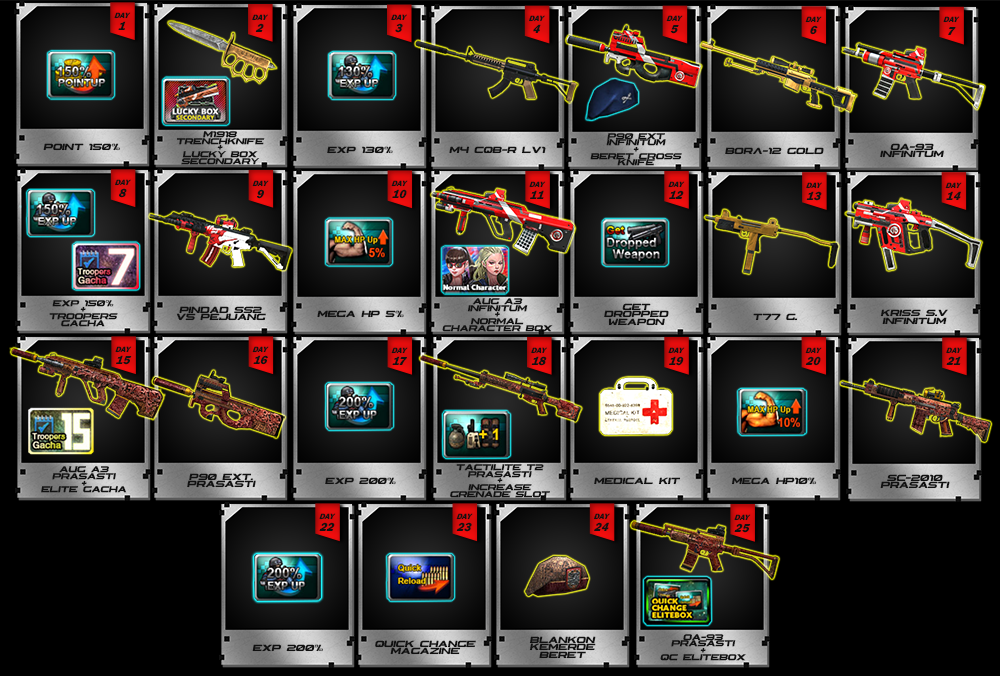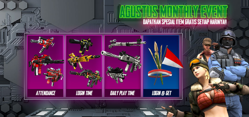 Banyak Hadiah - Hadiah menarik menanti kalian lho. Ayo Segera Login dan bermain Point Blank Indonesia ![]() Periode Event : 3 - 30 Agustus 2021 Dapatkan item - item menarik dari event spesial attendance kali ini, jangan sampai terlewatkan yah..!!! ![]() * Waktu & Item Reward dapat berubah sewaktu - waktu tanpa pemberitahuan terlebih dahulu === ![]() Periode Event : 3 - 30 Agustus 2021 * Login selama 100 menit setiap harinya antara pukul 11:00 - 15:00 WIB untuk mendapatkan item dibawah ini ![]() Setelah Maintenance Tanggal 13 Juli 2021 kalian dapat MEMILIH reward item diatas ATAU PB Alphabet Box hingga 8 Agustus 2021 untuk mengikuti EVENT SUPER LUCKY TROOPERS ![]() * Waktu & Item Reward dapat berubah sewaktu - waktu tanpa pemberitahuan terlebih dahulu ![]() Jangan Lupa Untuk Login ke dalam game yah!! Kami akan memberikan reward berikut ini untuk memeriahkan hari Kemerdekaan Indonesia ke-76 Tahun