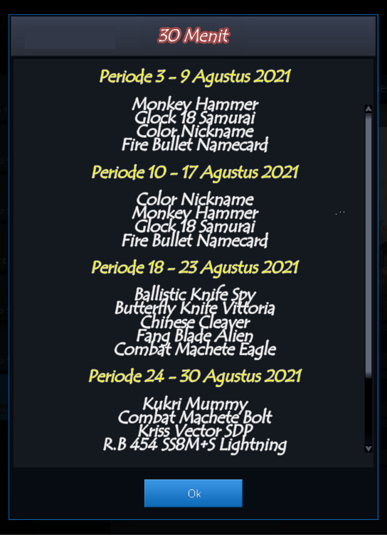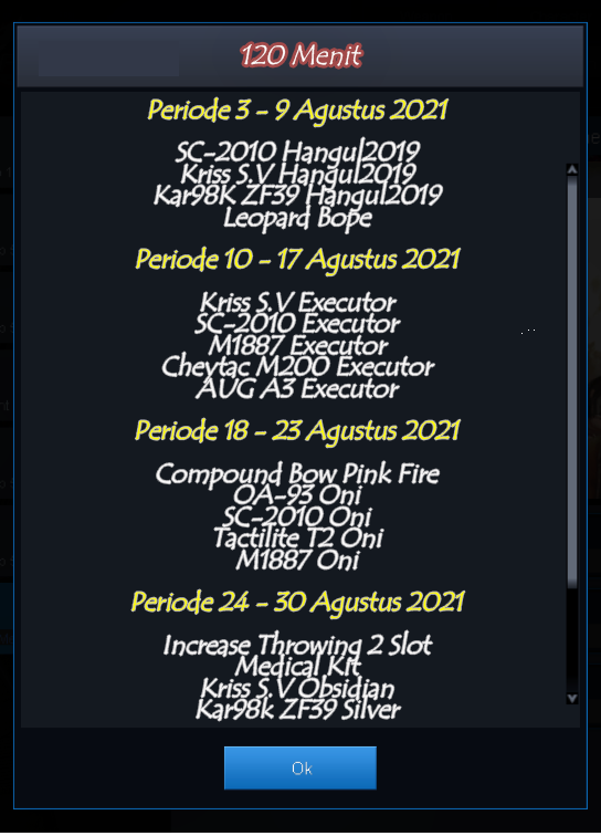 ( Periode Event : 17 Agustus 2021) ![]() * Item, ketentuan dan waktu dapat berubah sewaktu - waktu tanpa pemberitahuan terlebih dahulu ~ jangan sampai terlewatkan ya ~ ![]() Periode Event : 3 - 30 Agustus 2021 Bermain tanpa putus selama 30 , 90 dan 120 menit kalian bisa mendapatkan salah satu item - item dibawah ini ![]() ![]()