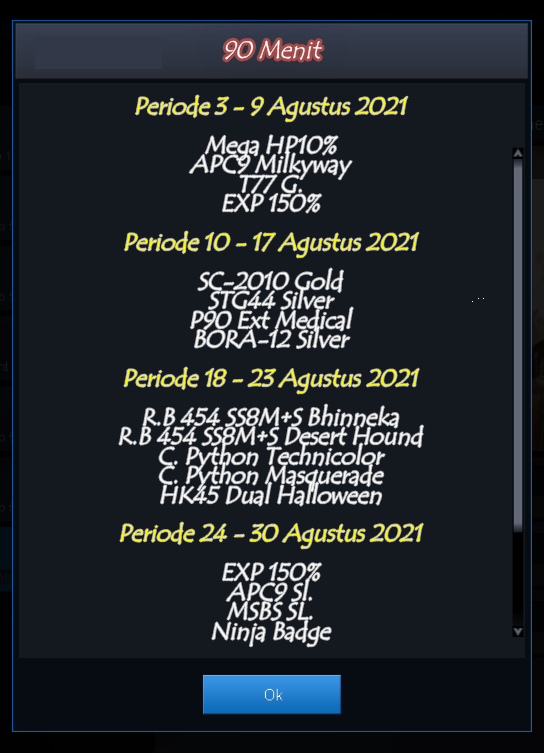 * Waktu & Item Reward dapat berubah sewaktu - waktu tanpa pemberitahuan terlebih dahulu==== ![]() 33 Jangan terlewatkan kalian juga bisa menikmati Exp Boost lho - Tahun Baru Islam 1443 H Boost EXP 100% + Point 100% pada 11 Juli 2021 - Hari Kemerdekaan Indonesia Boost EXP 100% + Point 100% pada 17 Agustus 2021 - Crazy Weekend Extra Boost EXP 200% + Point 200% di (Sabtu & Minggu) pada pukul 12.00 - 16.00 WIB dan 20.00 - 23.00 WIB * Waktu & Item Reward dapat berubah sewaktu - waktu tanpa pemberitahuan terlebih dahulu --------------- |