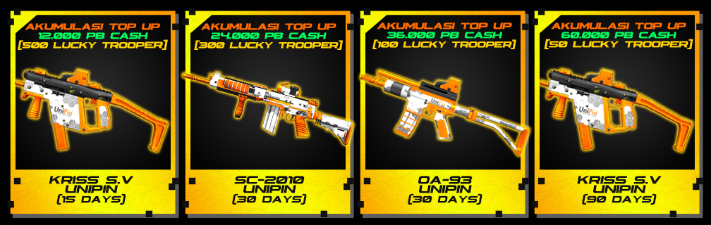 Hai Troopers, Menjelang Natal 2021 kali ini, UniPin dan Point Blank Beyond Limits kembali mengadakan Event Top Up untuk para Troopers!! Kalian berkesempatan untuk mendapatkan Weapon Series UniPin dan UniPin Credit Apabila telah mencapai Akumulasi Top Up tertentu. Untuk mendapatkan Reward Spesial UniPin x Point Blank Beyond Limits ini kalian harus mengikuti Syarat dan Ketentuannya berikut ini ya.. Syarat dan Ketentuan Event: 1. Periode event adalah 23 - 31 Desember 2021 2. Troopers Wajib Login ke akun UniPin terlebih dahulu sebelum melakukan transaksi. Belum punya akun UniPin? Yuk register di www.unipin.com. 3. Kalian berkesempatan untuk mendapatkan Weapon Series UniPin apabila telah mencapai Akumulasi Top Up Tertentu. 4. Promo ini berlaku untuk seluruh metode pembayaran yang tersedia pada Website UniPin 5. Reward yang tersedia memiliki Kuota yang Terbatas . 6. Reward akan dikirimkan dalam waktu 14 Hari Kerja setelah periode promo berakhir. 7. Pada Akhir Periode Event 25 Lucky Troopers berkesempatan mendapatkan 150.000 UniPin Credits ! 8. Promo ini tidak dapat digabungkan dengan promo lainnya. 9. UniPin berhak untuk mengubah dan/atau menghentikan promo sewaktu-waktu tanpa pemberitahuan terlebih dahulu jika ditemukan indikasi kecurangan selama berlangsungnya promo, dan segala perubahan dan keputusan yang dibuat oleh UniPin adalah Final serta tidak dapat diganggu gugat. 10. Segala Keputusan UniPin dalam menentukan Pemenang Promo adalah Mutlak dan tidak dapat diganggu gugat. ![]() *(Reward hanya berlaku jika kamu topup di website Unipin) **Setiap Akumulasi Top Up memiliki Kuota Reward yang Terbatas *** Contoh Akumulasi Top Up : 1. Mencapai Akumulasi Top Up Rp 100.000 atau 12.000 PB Cash maka 500 Lucky Troopers berkesempatan memenangkan Kriss S.V UniPin 15 Days. 1. Mencapai Akumulasi Top Up Rp 200.000 atau 24.000 PB Cash maka 300 Lucky Troopers berkesempatan memenangkan SC-2010 UniPin 30 Days. 3. Mencapai Akumulasi Top Up Rp 300.000 atau 36.000 PB Cash maka 100 Lucky Troopers berkesempatan memenangkan OA-93 UniPin 30 Days. 4. Mencapai Akumulasi Top Up Rp 500.000 atau 60.000 PB Cash maka 50 Lucky Troopers berkesempatan memenangkan Kriss S.V UniPin 90 Days. **** Reward Tidak Akumulasi Contoh: - Bila kalian telah berhasil memenangkan Reward pada Akumulasi Top Up Rp 300.000 atau 36.000 PB Cash maka kalian TIDAK akan mendapatkan Reward pada Akumulasi Top Up Rp 200.000 atau 24.000 PB Cash Ayo Topup menggunakan UniPin, Makin banyak untungnya!!! Langsung aja klik link berikut ini