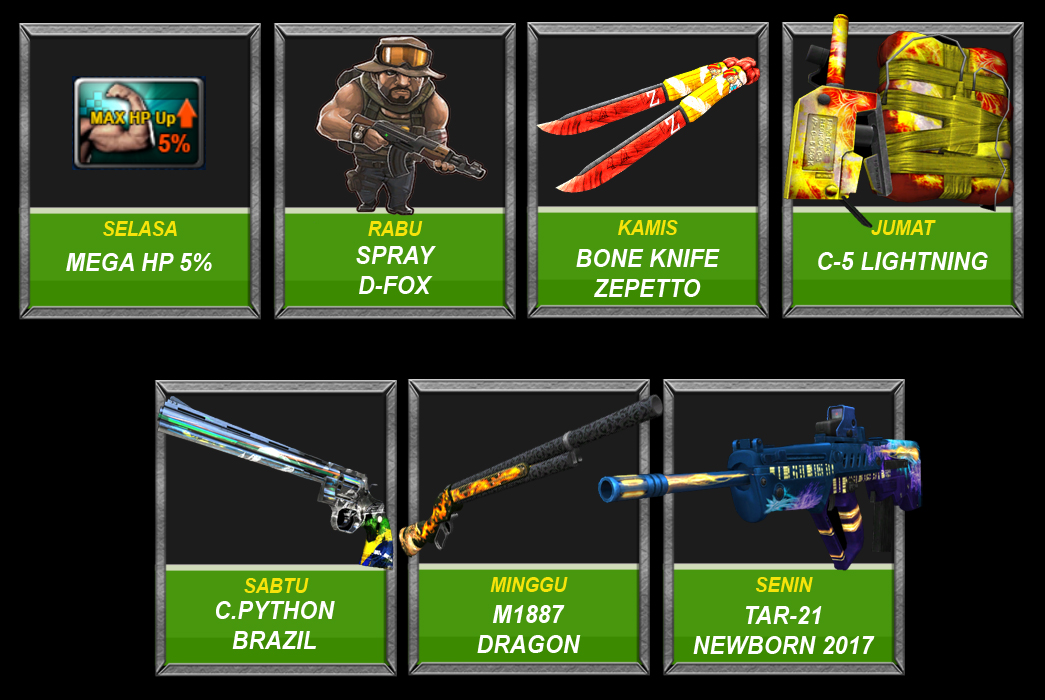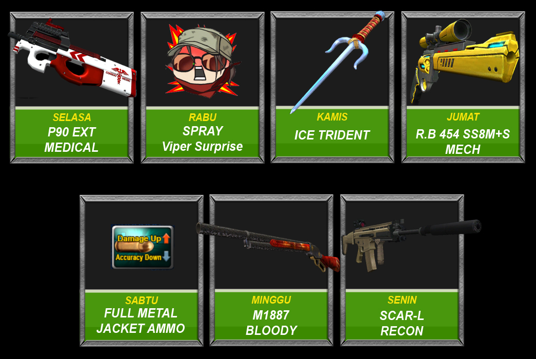 Hi, Troopers! Bagaimana libur panjang kalian ? Sudah balik ke rutinitas seperti biasa atau masih ada yang di kampung halaman nih ?? Point Blank minggu ini sudah siap update new item dan event loh untuk kalian. Ini dia Event di minggu ini, yukk Cekiiidott troops.. ![]() * Periode event 11 - 17 Juni 2019 * Login setiap harinya untuk mendapatkan item * Jika terlewat 1 hari kamu akan mendapatkan item dihari yang terlewatkan. ![]() ![]() * Periode event 11 - 17 Juni 2019 * Login selama 70 menit setiap harinya antara pukul 10:00 - 16:00 Wib. ![]() ![]() * Periode Event 11 - 17 Juni 2019 * Login di hari yang sudah ditentukan untuk mendapatkan itemnya. ![]() ![]() * Periode event 11 - 17 Juni 2019 * Login selama 30, 60 dan 100 menit untuk mendapatkan item reward * Item reward yang didapat secara acak bukan pilih. ![]() ![]() Masih di bulan Juni nih Troops, untuk kalian yang membuat ID baru di bulan Juni ini akan mendapatkan Caiman Grey, Wolf, Pindad Ice dan P90 Ext Ice. ![]() Terima Kasih ---------- Untuk pertanyaan lebih lanjut, kamu bisa langsung mengunjungi Fanpage, Discord, Website atau Ticket ke Customer Service kami. Official Fanpage: www.facebook.com/zepetto.game Official Discord: discord.gg/pbzepetto Official Website: www.pointblank.id Ticket ke Customer Service: bit.ly/2QgJ0DO |