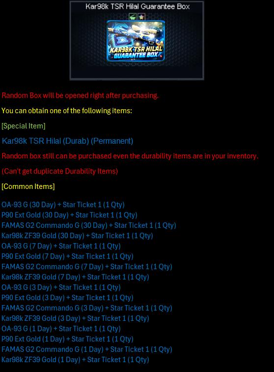 Hai Troopers Mau Jaminan Dapat Permanent Weapon??? Sekaranglah saatnya karena ada Guarantee Box yang menjamin kamu dapat Permenent Weapon Terbaru. Cukup membuka Kar98k TSR Hilal Guarantee BOX Sebanyak 500 BOX maka kalian akan mendapatkan Kar98k TSR Hilal Permanent. Periode : 4 November - 1 Desember 2025 ![]() Dari Kar98k TSR Hilal Guarantee BOX kamu akan berkesempatan untuk mendapatkan Kar98k TSR Hilal Permanent ![]() atau