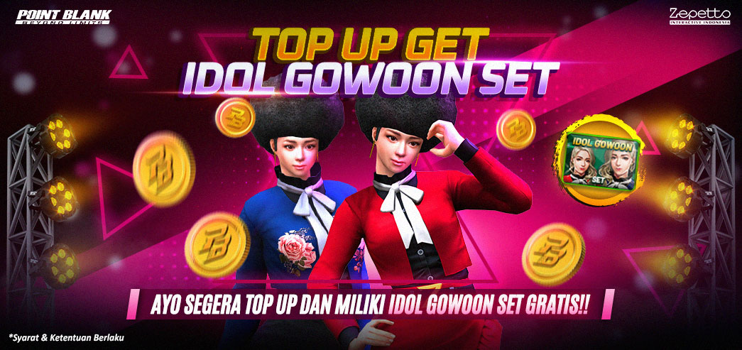 *(Reward Spesial Item per 1 User ID Max 1 Item Per Denom) Contoh : Kamu telah Top Up 6.000 PB Cash maka kamu akan mendapatkan Idol Gowoon Set (2 Hari) kemudian kamu Top Up Kembali 24.000 PB Cash maka kamu akan mendapatkan Idol Gowoon Set (7 Hari) kemudian kamu Top Up Kembali dengan Denominasi yang sama yaitu 6.000 atau 24.000 PB Cash maka Reward TIDAK akan kamu dapatkan kembali **(Syarat ketentuan dapat berubah sewaktu-waktu tanpa pemberitahuan terlebih dahulu) Isi dari IDOL GOWOON SET :